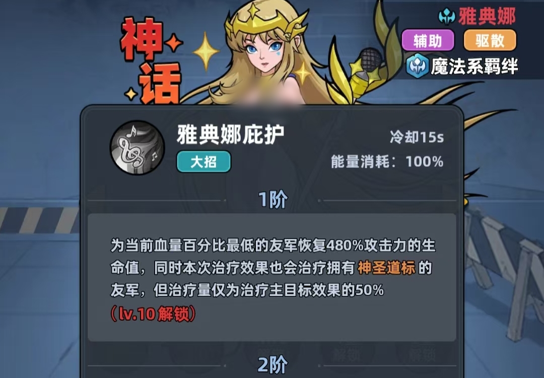 大招为范围型强力治疗技能,当场上存在处于“神圣道标”状态的友军时,该目标将同步获得大招治疗收益。其基础治疗倍率极高,可在瞬时将濒危单位血量拉升至安全阈值。星级进阶后,机制进一步深化:一星解锁“雅典娜之盾”效果——受战技治疗的队友将额外获得减伤增益,并对攻击自身的目标触发强制眩晕;二星则激活“圣衣之力”,大招治疗期间为全体队友附加攻速提升,且队伍中攻击力最高的单位(通常为主C)将优先获得该增益的强化版本。
