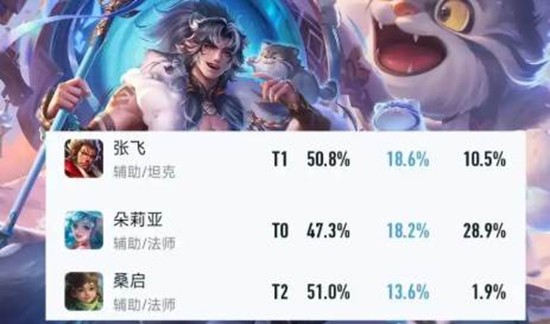 张飞18.6%登场率证明“万金油”永不过时,大招反打保C一体成型;朵莉亚刷新机制稳坐T0,但吃队友阵容;桑启凭免费皮肤加持冲上前三,51%胜率奶量管饱。