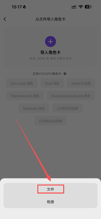 选择文件导入角色卡。点击“从文件导入”,并选择需要上传的JSON文件。