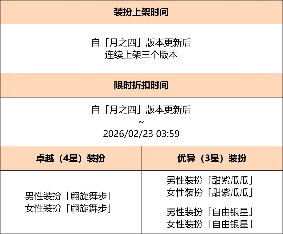● 「月之四」版本更新后,共计2套卓越(4星)装扮、4套优异(3星)装扮限时上架千星商城,在上架期间均限购1次。