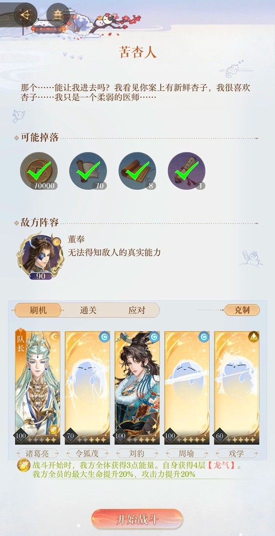 练度命盘参考和配队见图,练度普遍偏高仅供参考,董奉洞窟核爆能解决,因为有诸葛亮令狐茂和戏学不刚需+4,黄月英洞窟全自动即可。