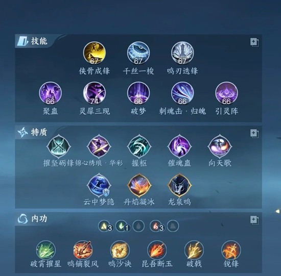 依然老一套,融甲和锐锋可以互相替代,看进攻分。仓库吃灰的破宵也可以用了,主要是因为九灵比其他职业更吃会心,会心率低于60%,引灵阵和催魂蛊就要打折扣。同样也是因为这俩会伤加成,九灵武器打造用惊锋会被稀释,一键九灵更推荐龙光,本内本外都稳定占比3.5%左右;老三首领打造不推荐了,它的特效圈巨小,远程职业丢伤严重。