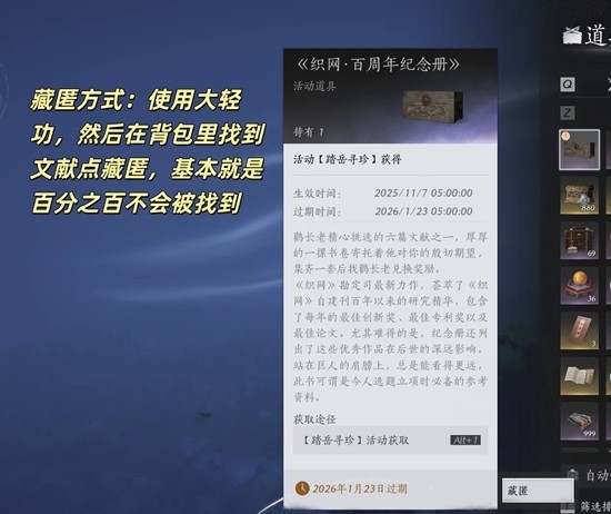藏匿方式:使用大轻功,然后在背包里找到文献点藏匿,基本就是百分之百不会被找到