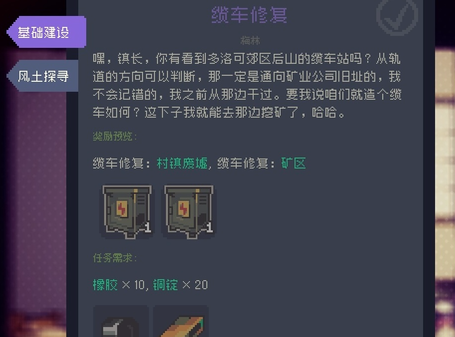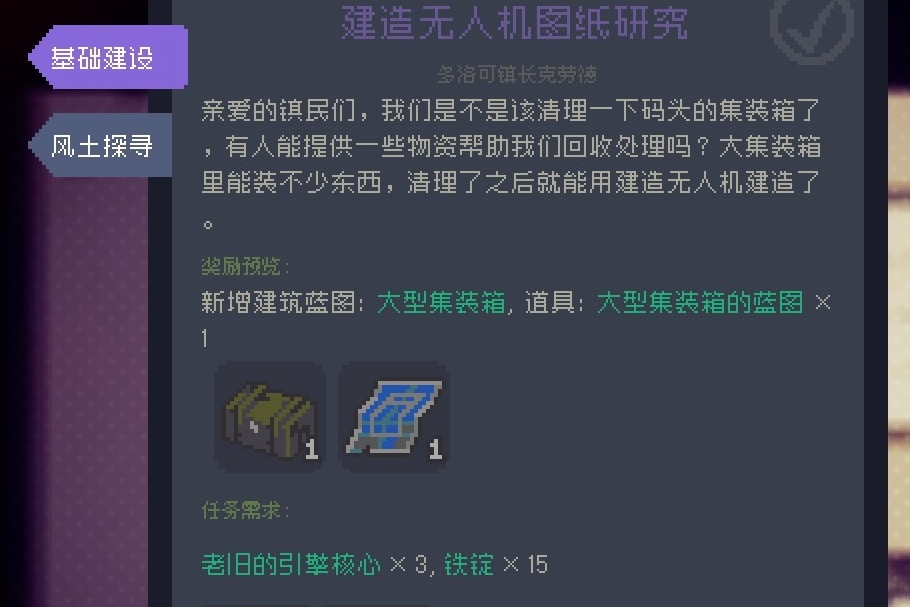 (这个任务解锁小摩托之后会比较容易,小摩托的任务在邮箱里,是朗克的邀请,你需要准备一些废铁片、废铜片、老旧的核心,完成之后就可以解锁小摩托)
