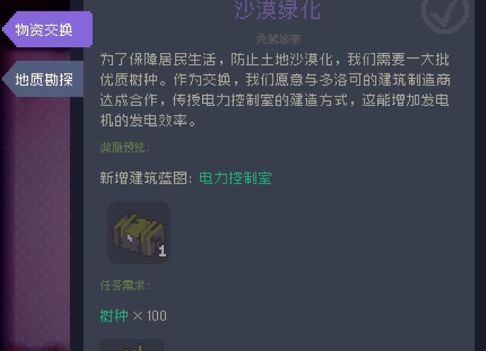 2、沙漠绿化:这个任务需要收集100个树种,在前期就需要开始积累,因为树种并不像树木一样随处可见,是概率掉落的,所以别到要开始做任务才开始收集