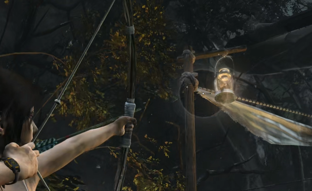 抵达平台后,前方将出现三只悬挂灯笼。需逐一拾取并向前投掷,借助灯光照亮路径。光亮映射下,可辨识出两个缠绕布条的木桩,翻越后抵达另一侧,可见一具静止尸体,其头顶悬吊一只灯笼。使用弓箭精准射击该灯笼,使其坠落并引燃下方立柱。随后推动已燃立柱,令火焰顺势传导至相邻数根立柱。