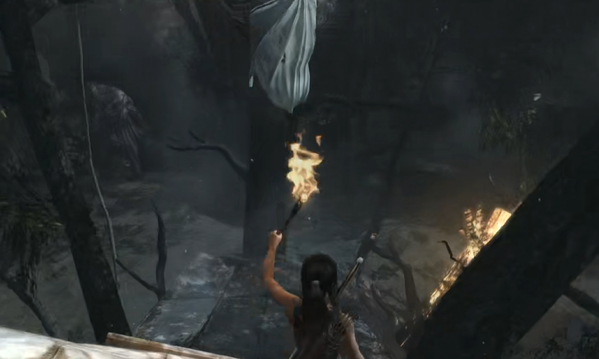 当其余立柱全部被点燃后,会发现角落尚存一根未燃立柱。此时需转向附近堆放的货物箱,跳跃登顶,再向上抓握横梁,摇晃使悬挂火盆坠落。火盆触地后引燃货堆,继而点燃内部预设导火细线,火势沿细线蔓延至最后一根立柱,完成最终引燃。随着整组结构连锁坍塌,飞机残骸顶部开启通路,玩家即可进入机舱内部搜寻最终宝藏。