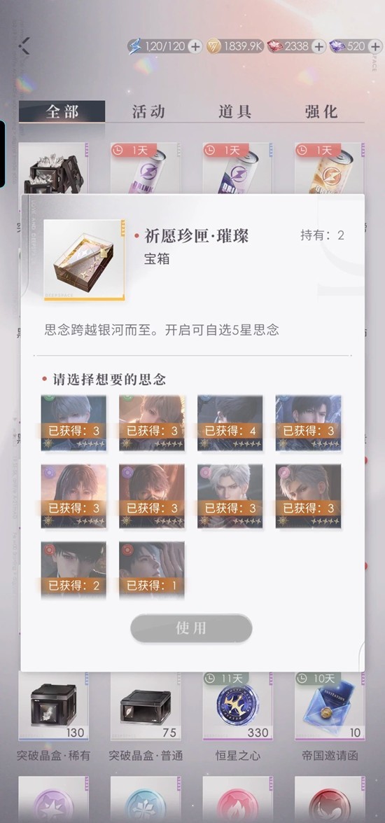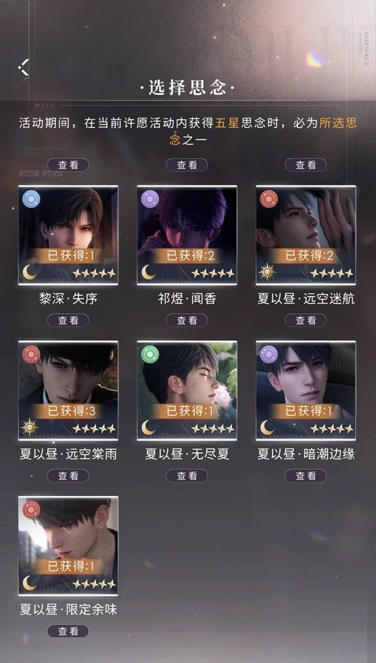 1.所有常驻许愿思念任选5张,从本特别许愿池中获得的五星思念,必为所选思念