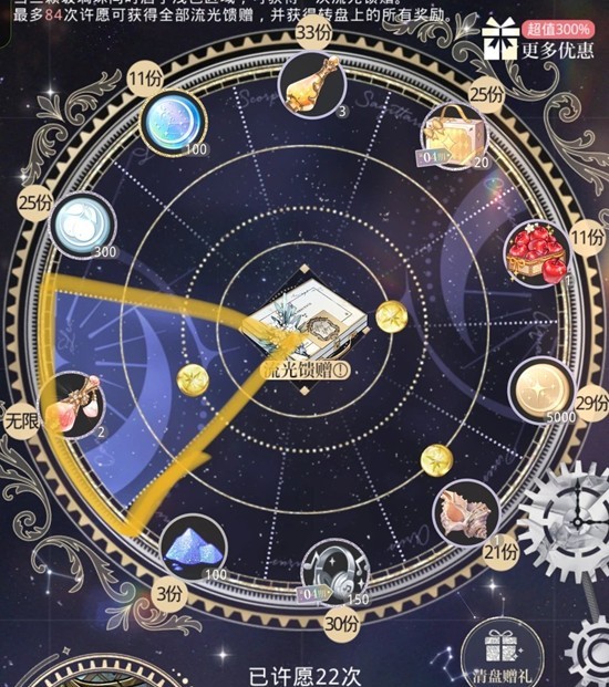 转盘抽齐三个大奖就可以清盘,三个大奖的保底分别是72、78、84次,这也是保底清盘84抽的依据。