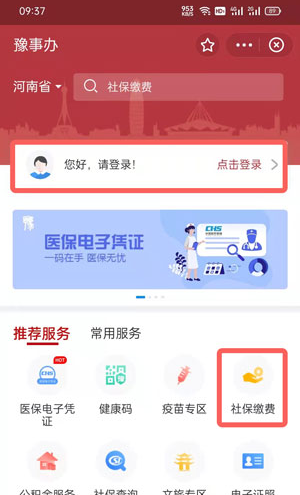 3、在豫事办小程序,先点击【点击登录】登录你的个人账号,然后点击【社保缴费】服务;