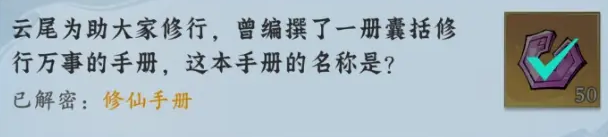 2、云尾为助大家修行,曾编撰了一册囊括修行万事的手册,这本手册的名称是?修仙手册