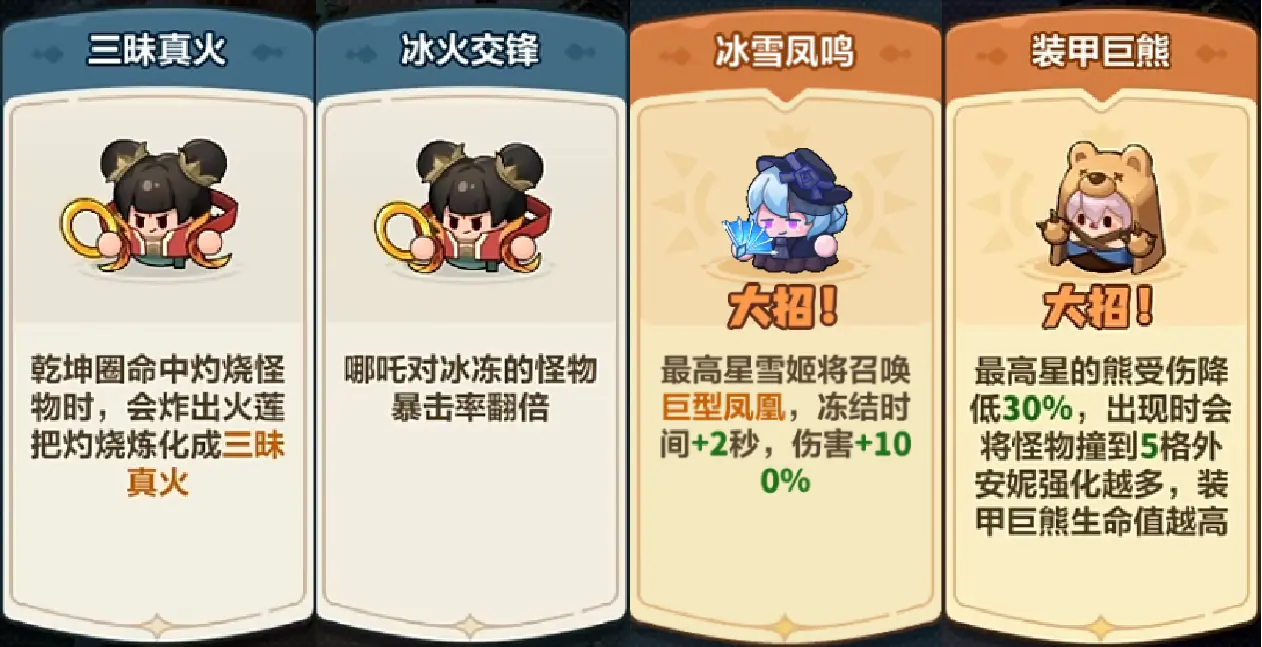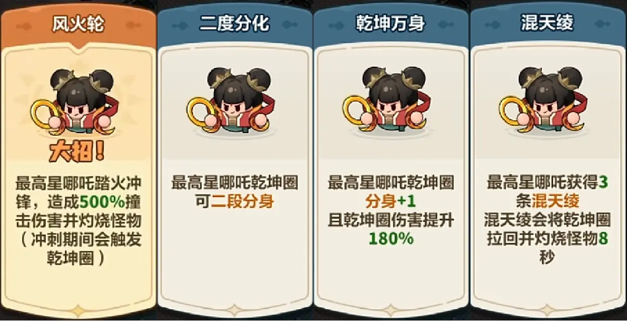 哪吒是这套阵容的核心输出,达到10级解锁大招风火轮和初始获得乾坤分化技能后,不论是对精英首领还是小怪,都能造成非常高额的伤害。