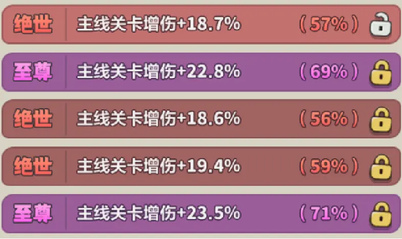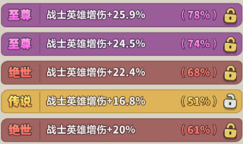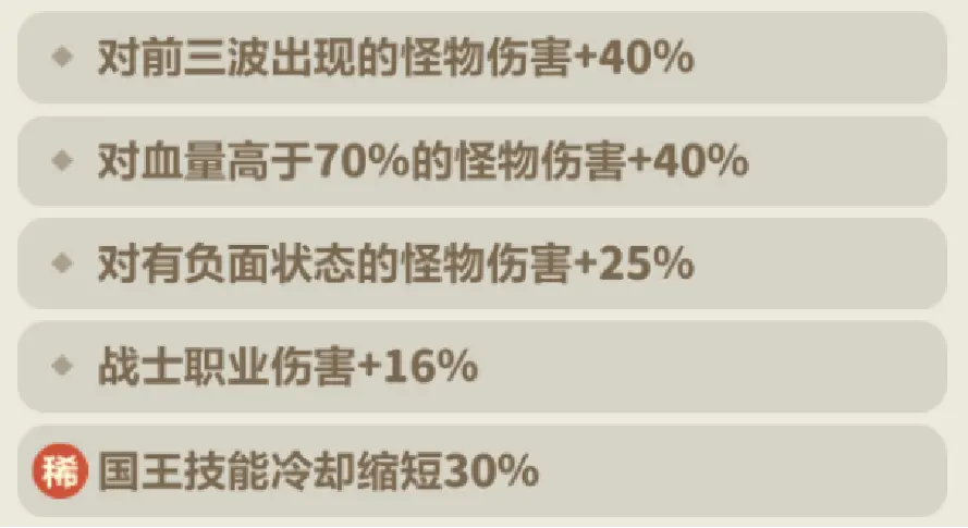 推荐 5 个主线增伤图腾,或者 4 个主线增伤和 1 个首领增伤。注意:主线增伤同样对国王生效,在推主线时比单独的职业增伤好用!如果没有也可以携带单独战士增伤。