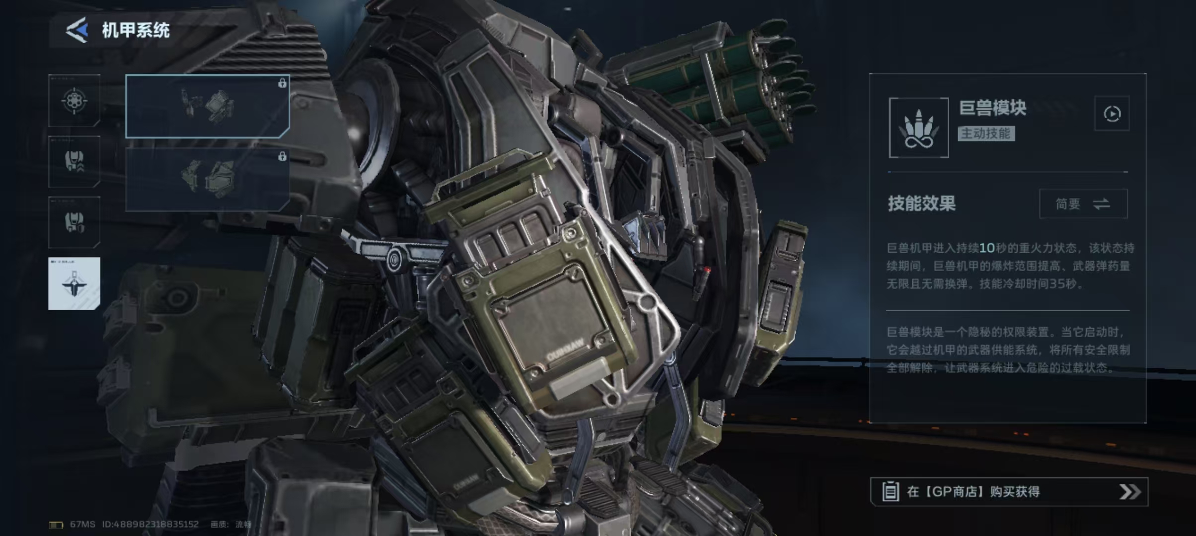 前胸核心模块提供两种战术方向:【巨兽模块】激活后进入重火力状态,期间持续输出范围伤害且无需换弹,冷却时间35秒;【无敌屏障】则赋予使用者4秒完全免疫伤害的防护窗口,冷却时间为25秒,适用于高危机制应对场景。