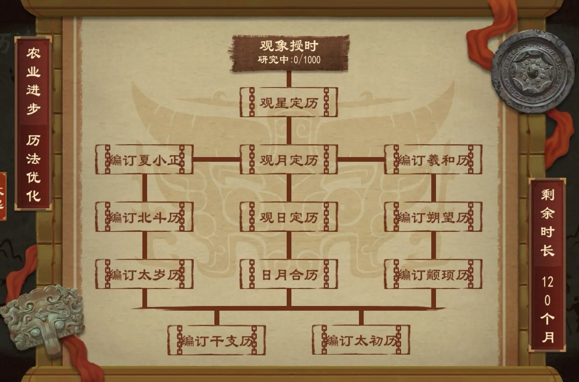 在历法优化内,玩家可以研究历法优化技术提高历法修正与校准效果,10年后或完成历法优化所有技术后将回到原先的技术时代。玩家每次进入历法优化的间隔最短为30年。