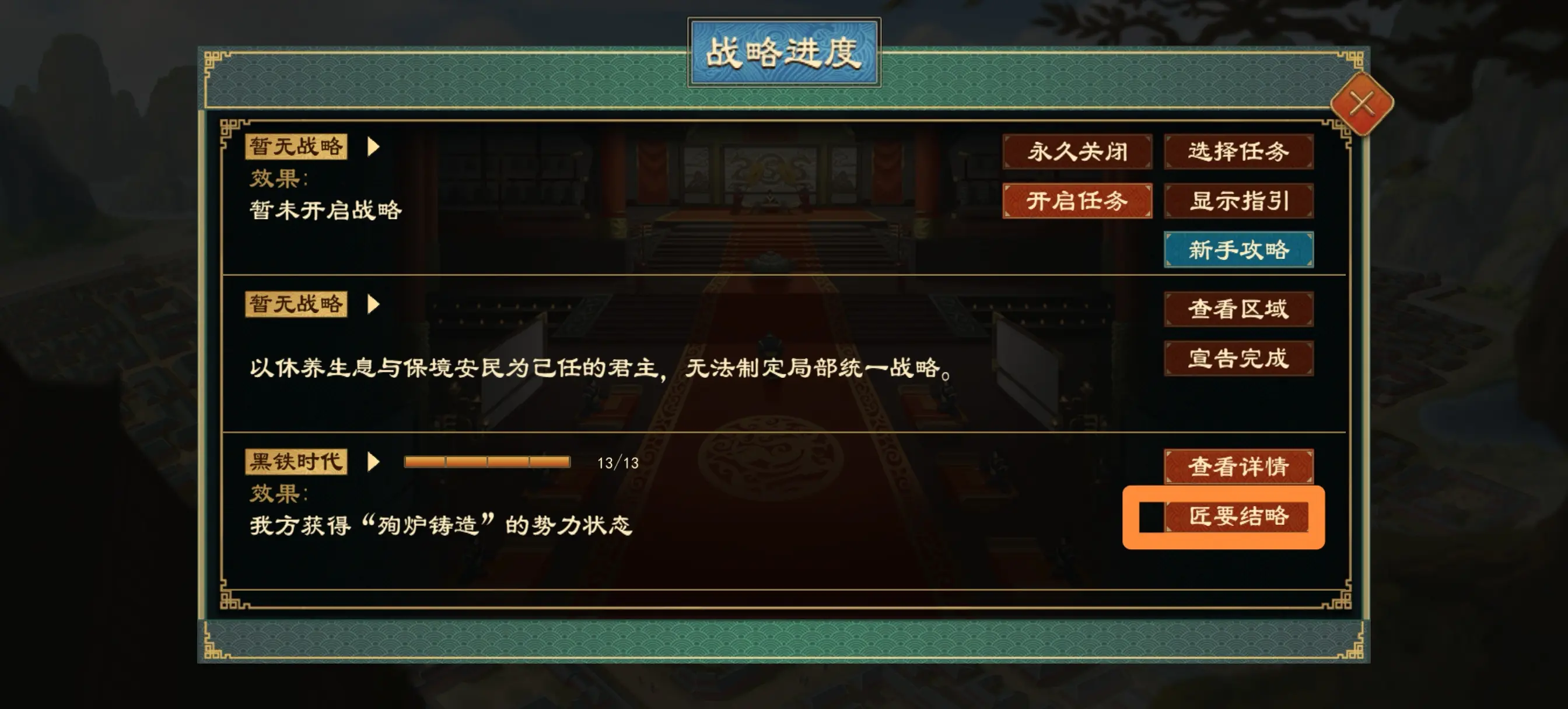 备注:完成黑铁技术政策后,需手动在战略界面点击匠要结略才可获得相关学派技术进度加成。
