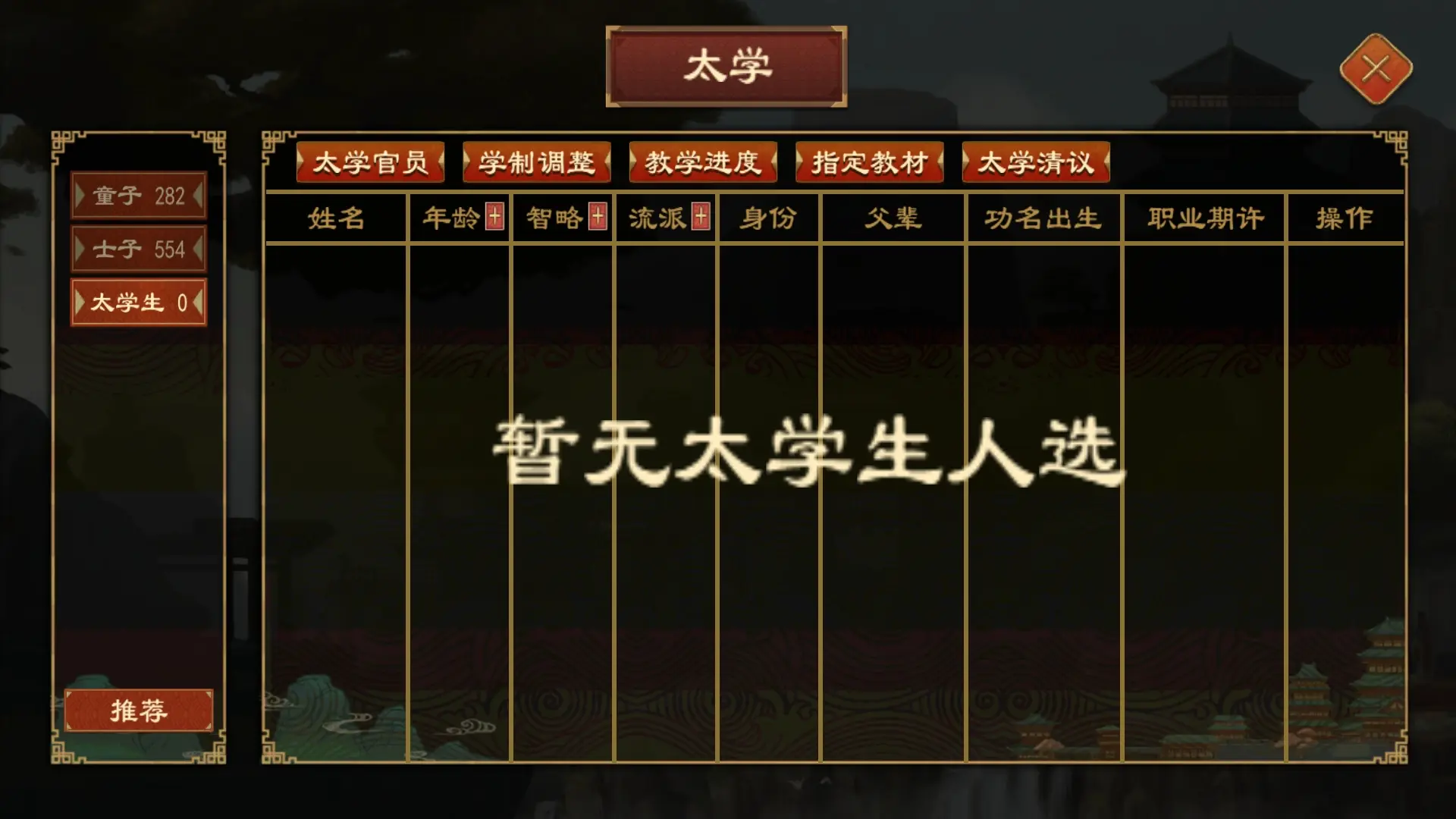 玩家也可以消耗君威,使用推荐按钮选择人物将其推荐进入太学