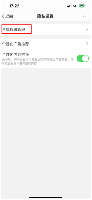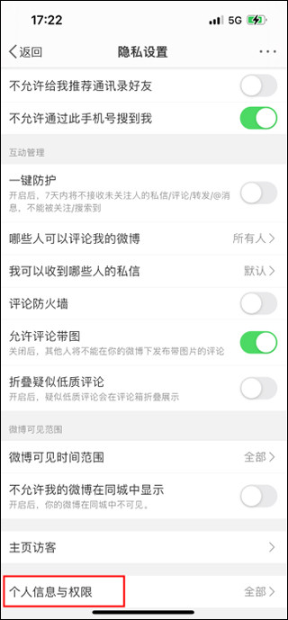 进入到隐私设置页面,滑动屏幕到页面底部,点击“个人信息与权限”选项;
