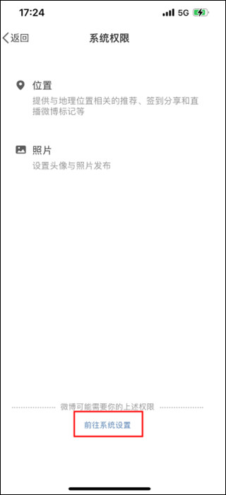 进入到系统权限页面,可以看到有位置这项权限,点击页面底部的“前往系统设置”按钮;