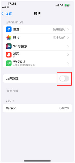 进入到微博的手机系统管理权限页面,将“允许跟踪”选项右侧的开关按钮关闭就不会再显示ip地址了。