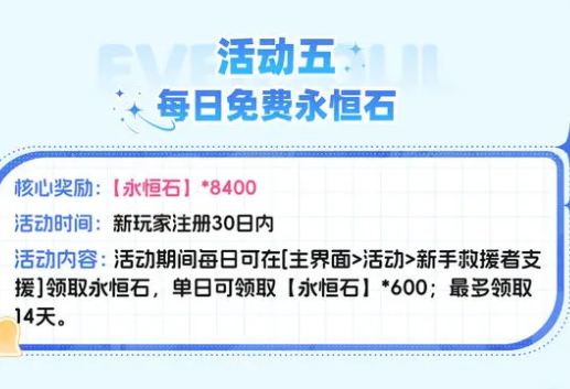 游戏资源加载完成后,新账号将即时获得10张永恒召唤券,该资源不可重复领取,专用于新手期高优先级抽卡,助力玩家在前3日快速锁定核心精灵。注册后30日内,每日可通过【新手救援】活动领取600枚永恒石,连续领取上限为14天,总计可获8400枚永恒石,可用于兑换召唤券、强化材料及限定道具。