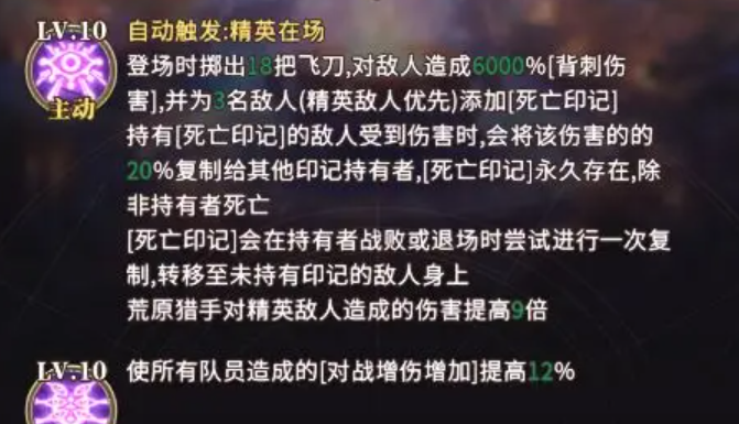 荒原猎手登场即触发主动技能:瞬发18把飞刀,对敌方全体造成总计6000%攻击力的背刺伤害,并为其中3名敌人施加「死亡印记」。该印记优先分配给场上存在的精英单位;若无精英,则随机选取普通敌人。