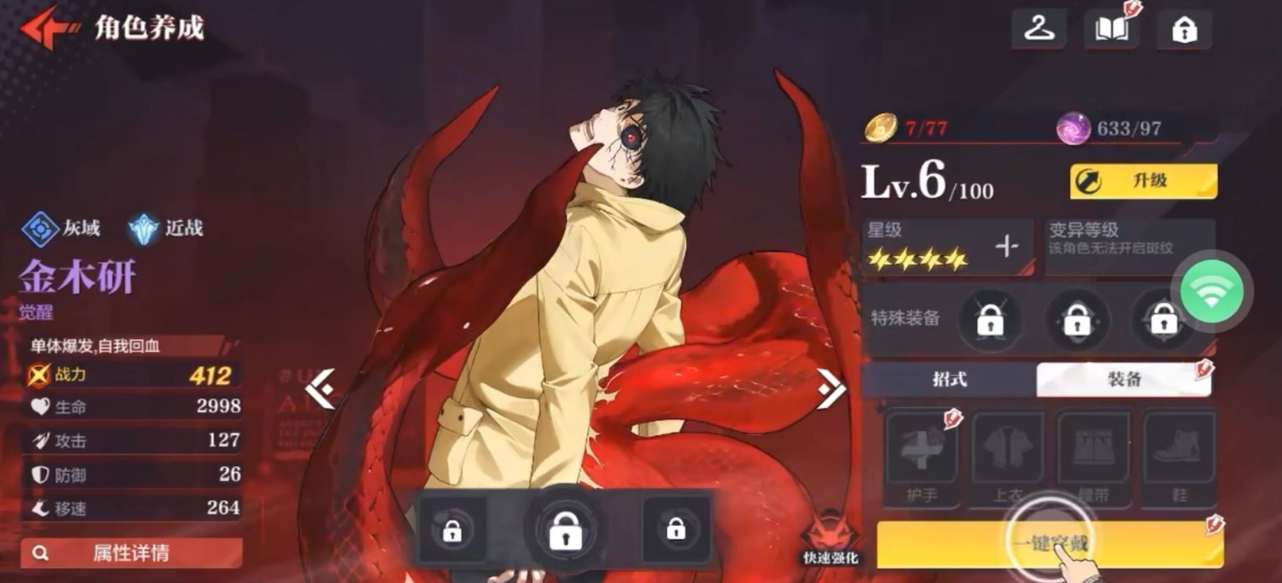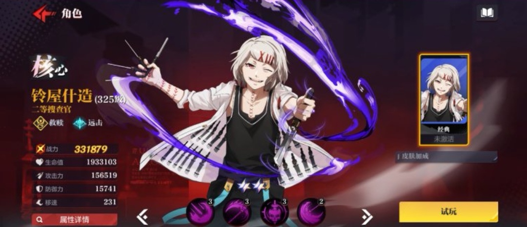 第一位:金木研,隶属不灭阵营的高机动近战输出。其核心机制围绕“低血增伤”与“免控突进”构建。主动技【狂刃血宴】消耗怒气发动,以尾赫化形为血色旋风突袭敌方攻击最高单位,附带范围物理伤害,施法全程免疫控制效果;生命值每降低10%,该技能基础伤害提升8%。【碎空裂抓】实现位移+背击双效,对路径上所有敌人造成高额物理伤害,每次命中额外获得50点怒气。被动【半赫者】提供固定比例的生命值与攻击力加成,强化持续作战能力。
