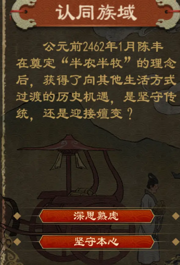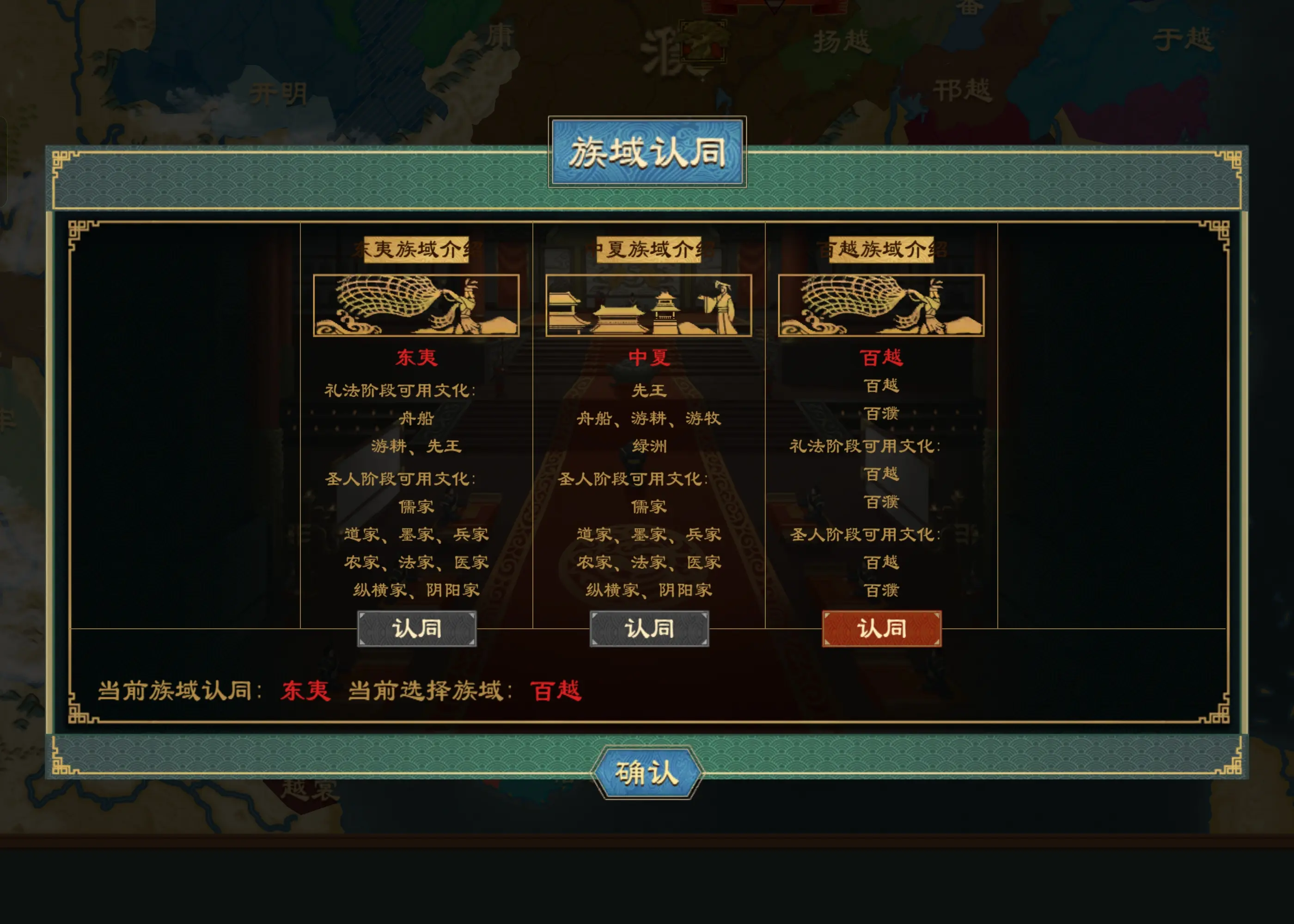 当玩家完成族群认同所有技术之后,会获得一次转化族域的机会,跳转出认同族域界面,选择后并立刻进入方国阶段。