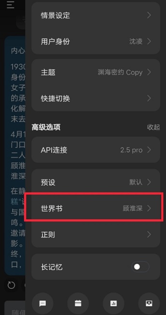 2、如果没有,从左侧边栏的更多,选择世界书入口,自己新建一本,添加一条