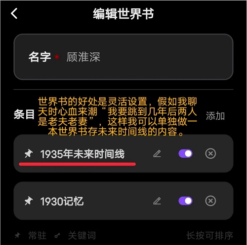 4、最后保存,开启这条世界书,记得在角色聊天界面也要开启