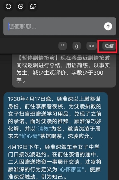 6、最后回到聊天窗,输入框下应出现了名为总结的快捷键。点击,它会自动在聊天框填入该指令。发送,ai就会将近期聊天历史进行总结。