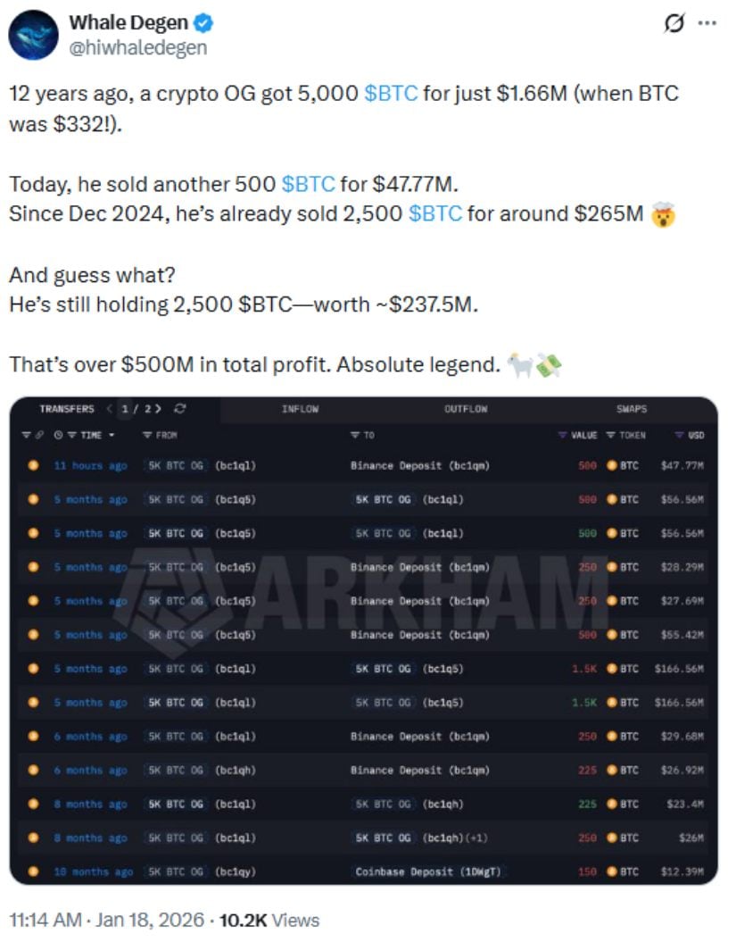 某加密投资者将当初166万美元购入的5,000枚BTC转化为超5亿美元总收益,现已套现半数仍持有2,500枚。来源:Whale Degen via X