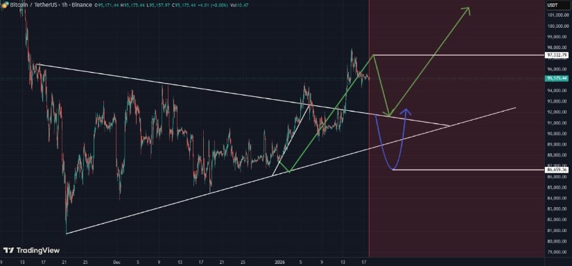 技术框架:分析师指出只要比特币守住趋势线,就可能延续上行趋势。反之若跌破该结构,或引发短期回调至9万甚至8.6万美元。这些区间对应历史盘整区域而非精确预测目标。