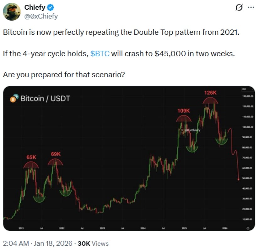 比特币呈现类似2021年的双顶形态,若四年周期重演,BTC未来数周或跌至4.5万美元。来源:Chiefy via X