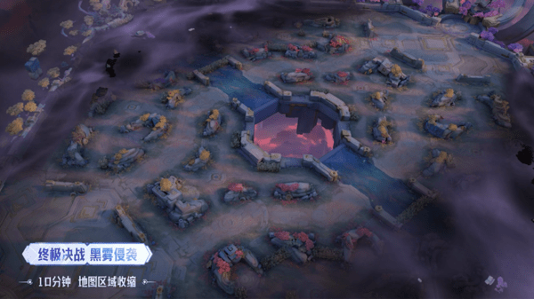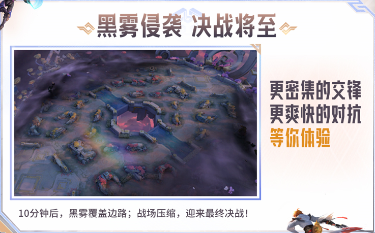 在对局进行到10分钟后,黑雾侵袭机制将替代原有的终极决战机制,黑雾将从地图两侧蔓延并覆盖两条边路,玩家将无法进入边路,同时边路也不再生成兵线,双方将在中间两条分路进行最终的对抗。