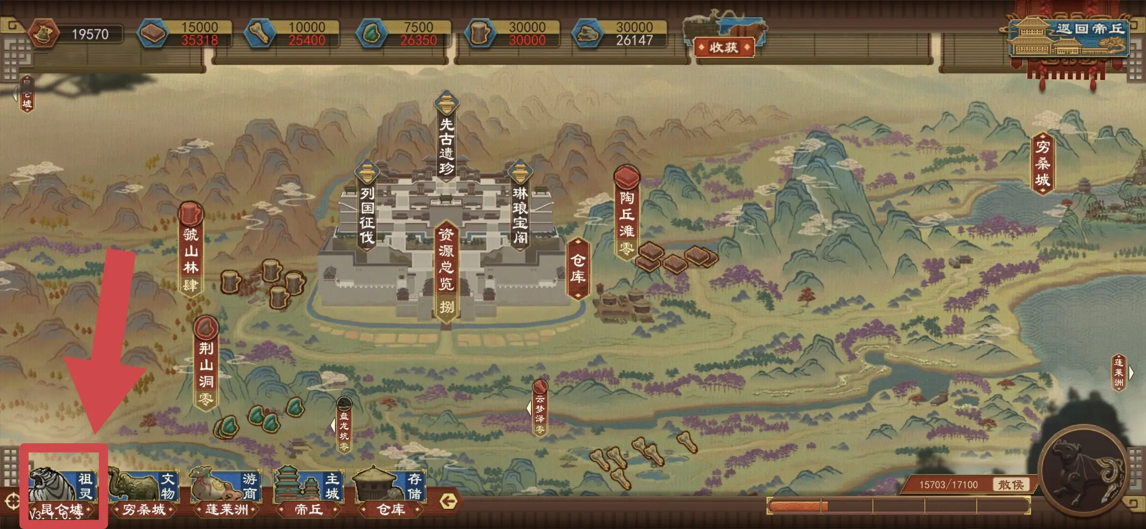 上面的那些材料啊右下角的进度啥玩意都不用管。先点左下角的昆仑墟然后点击左下角的昆仑墟