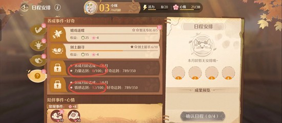 心情值“高”可以多安排“事件”,心情值“低”可以多安排和暖暖“陪伴”游玩。