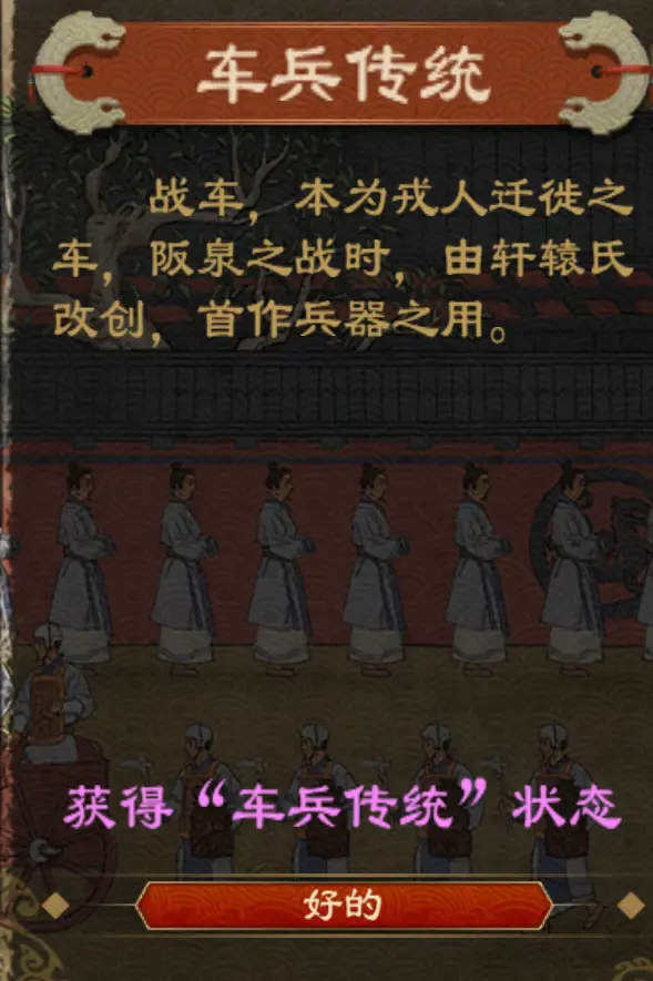当完成木石时代的"畜力战车"技术后,会获得"车兵传统"状态,并解锁配置车兵兵种。
