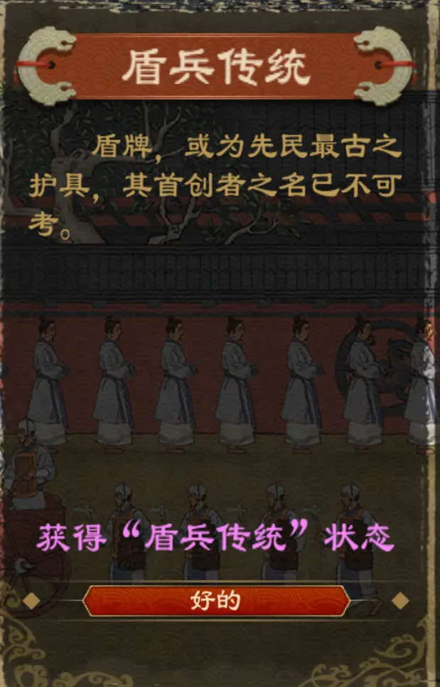 当完成青铜时代的"原始铜盾"技术后,会获得"盾兵传统"状态,并解锁配置盾兵兵种。