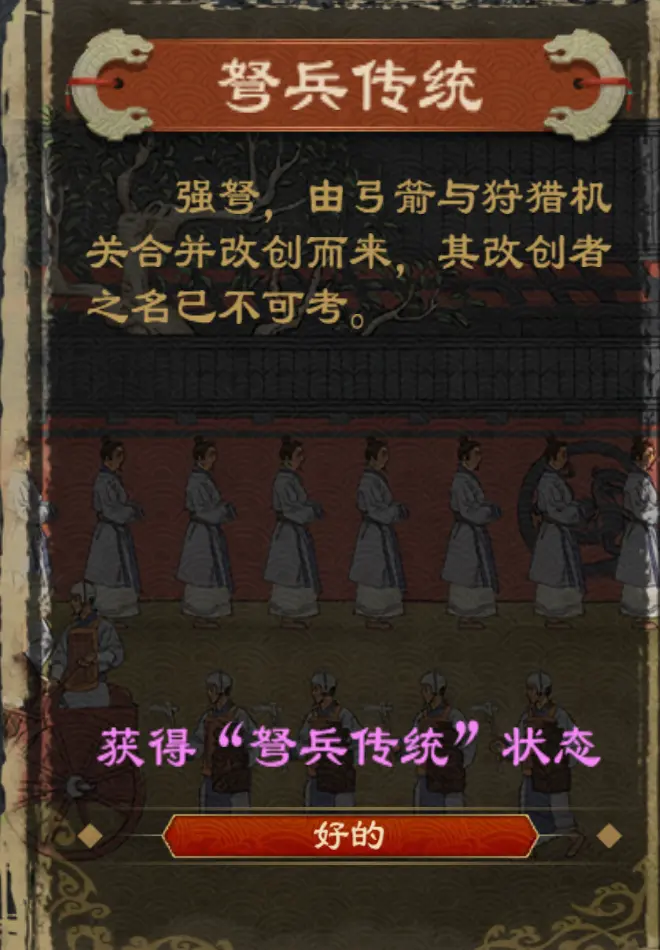 当完成青铜时代的"青铜构件"技术后,会获得"弩兵传统"状态,并解锁配置弩兵兵种。