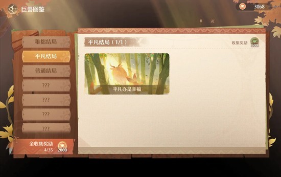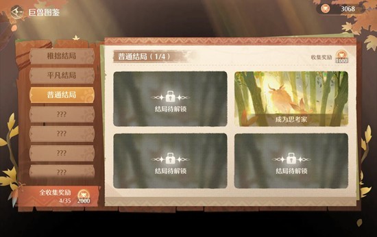 第四只巨兽,可以在普通结局里4选1。包括《冲呀大力士》总值>1996,有A没S且力量最高;《成为思考家》总值>1996,有A没S且头脑最高;《友好大毛绒》总值>1996,有A没S且情感最高;《热烈探险家》总值>1996,有A没S且好奇最高。课程安排示例和图三差不多,注意均衡每种属性数值,游玩喂食亲密互动按需。然后看一下巨兽成长日记里还有啥没完成,注意完成下就ok了。