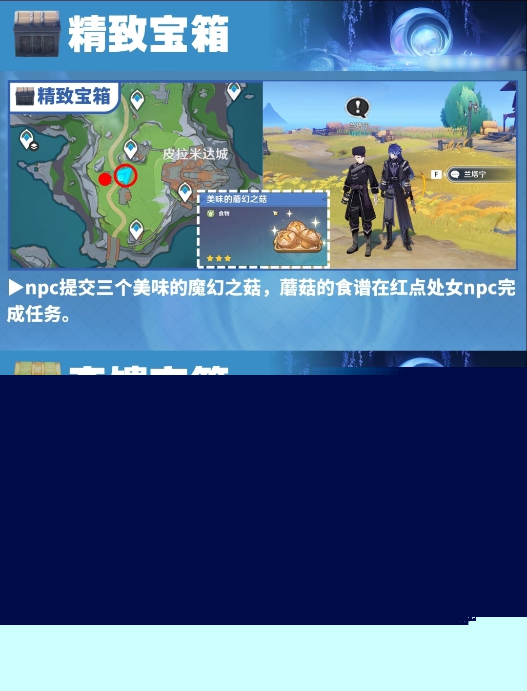 精致宝箱:npc提交三个美味的魔幻之菇,蘑菇的食谱在红点处女npc完成人物。