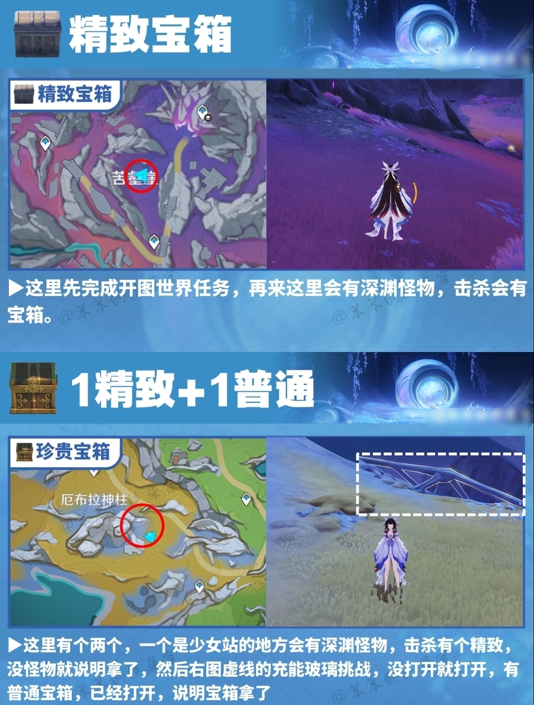 精致宝箱和普通宝箱:这里有两个,一个是图片里少女站着的地方会有深渊怪物,击杀有个精致宝箱,没怪物就说明已经拿了,然后右图虚线的充能玻璃挑战,没打开就打开,有普通宝箱,如果已经打开了就说明已经拿了。