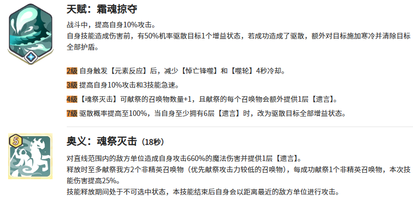 核心机制围绕两项秘技展开:第一项可在目标无任何增益状态时,提供33%的伤害加成;第二项则针对带有元素减益效果的敌人,激活生命值转化为额外输出的转化机制。配合奥义技的直线范围伤害与不可选中特性,可实现对纵列敌人的高效清场。天赋赋予其主动驱散能力,并支持通过献祭己方召唤物来强化自身属性;当遗言层数叠满后,还可一次性清除全部遗言状态,使其在对抗以多层增益维持站场的敌人时展现出显著压制力。