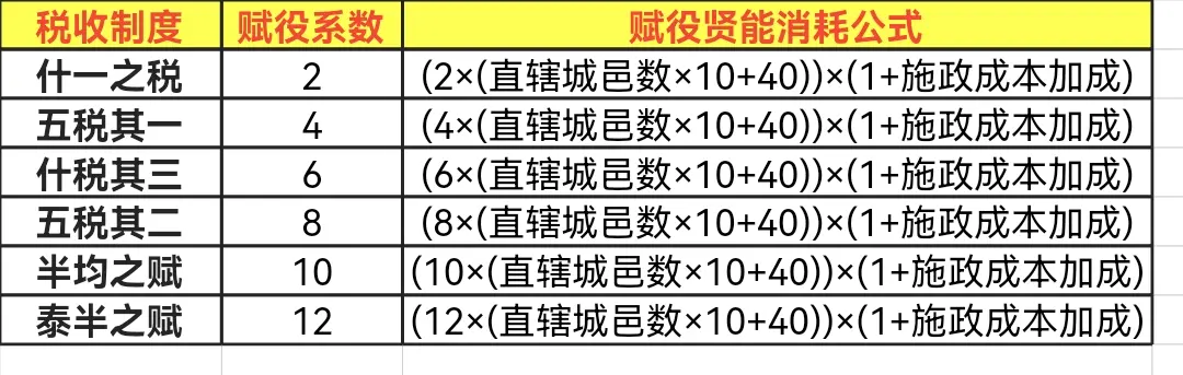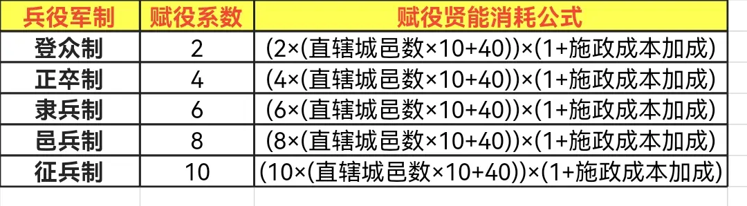 [赋役系数×(直辖城邑数×10+40)]×(1+施政成本加成)