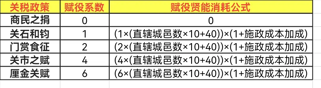 赋役贤能消耗公式为: