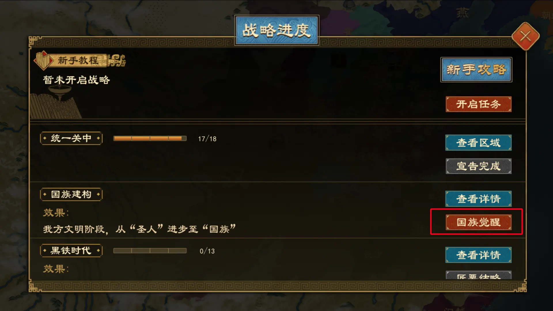 在满足一系列条件的情况下,可通过战略内的国族觉醒按钮进入国族阶段。在进入国族后,正策系统将重新构建,转为由独尊正策、杂糅正策和引申正策三部分构成。