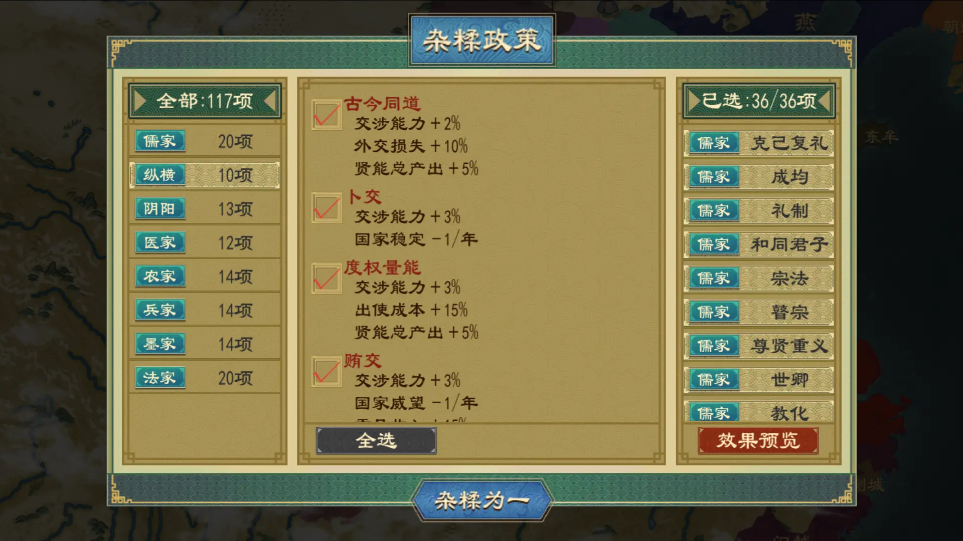同时可在剩余流派中,选择任意36项已实施完成的正策,组成杂糅正策。