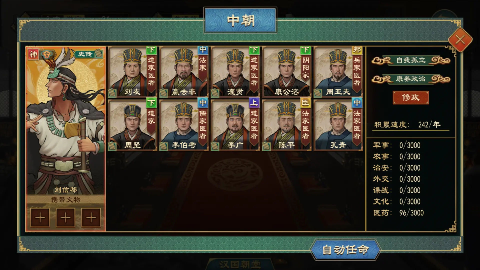 在引申正策中,可以颁布XX结集以获得其职业身份。此处以医士身份举例,在消耗正策点数颁布该正策后,我方养生能力不低于100的宗亲、公卿、朝臣将立即获得医士身份,而医士身份作为中朝辅政人员能积累更多《康养z治》正策点数。
