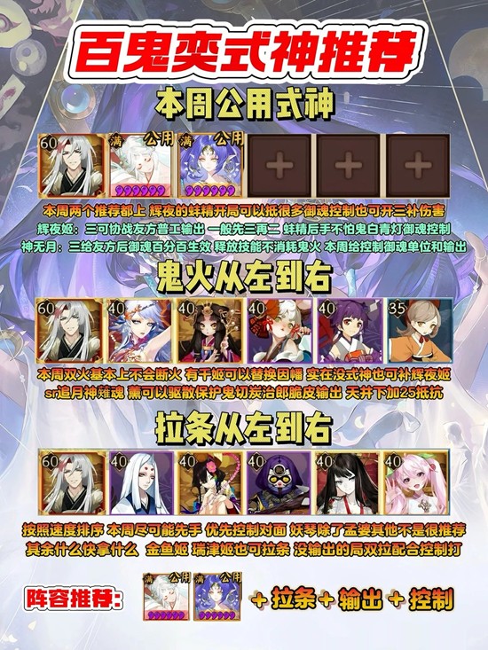 ①大辉夜:❶技能解读:二技能打火,三技能邀战行动过的友方❷本周用法:神无月打火是足够的,这周招财还多,鬼火肯定是溢出的,只有拿到了控制或者没输出,可以补大辉夜,大辉夜有蚌精可以开局防鬼使白还有魍魉,其余可以不上大辉夜补奶,驱散都可以